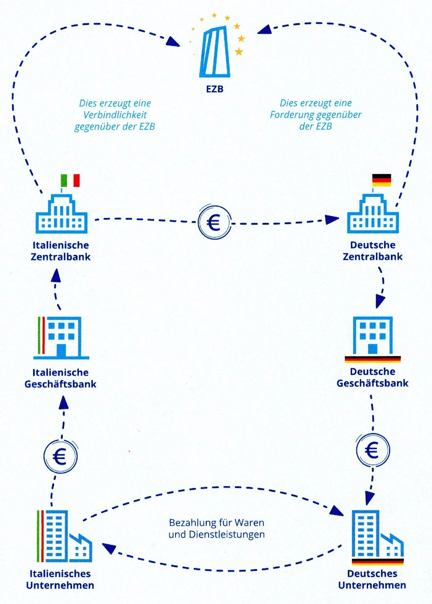 Ein Text der Bundesbank besagt zur Frage folgendes: Die Banca d'Italia belastet das Reservenkonto der italienischen Zahlerbank, während die deutsche Bundesbank Reserven in gleicher Höhe der deutschen Zielbank gutschreibt.[17] Der fällige Euro-Betrag wird von der Zahler-NZB in ihren Büchern gelöscht, und von der Ziel-NZB in ihren Büchern neu eingetragen. Genauer gesagt, die Banca d'Italia bucht ihre Verbindlichkeit gegenüber der italienischen Zahlerbank aus (= die bisherigen Reserven-Guthaben der Zahlerbank), und die Bundesbank bucht eine gleich hohe Verbindlichkeit an die deutsche Zielbank ein (= neues Reserven-Guthaben der Zielbank bei der Bundesbank). Aber: zwischen den beiden NZBn findet keine Bezahlung i.S. der Übertragung von Geld-Guthaben oder anderen Vermögenswerten statt. Überschrieben werden lediglich NZBn-Verbindlichkeiten (= Bank-Guthaben bei der jeweiligen NZB).